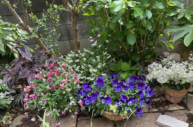 秋から大活躍のビオラ達はそろそろ終焉の時期。少しでも長く楽しめるように日陰で管理。寄せ植えビオラはここのところの暖かさてパカって割れちゃったのでさよならしました。